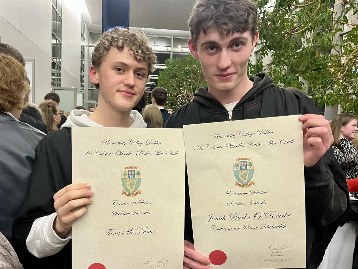 Comhghairdeas ó chroí le Finn Mc Namee (Bithleigheas) & Jonah Burke (Stair & fealsúnacht) a bhain scoláireachtaí iontrála d'Ollscoil Bhaile Átha Cliath (UCD) amach. Comhghairdeas ollmhór le Ellie Ní Riain freisin a bhain gradam iontrála i gColáiste na Tríonóide amach. Guímid gach rath orthu san ollscoil. Táimid uile an-bhródúil asaibh.